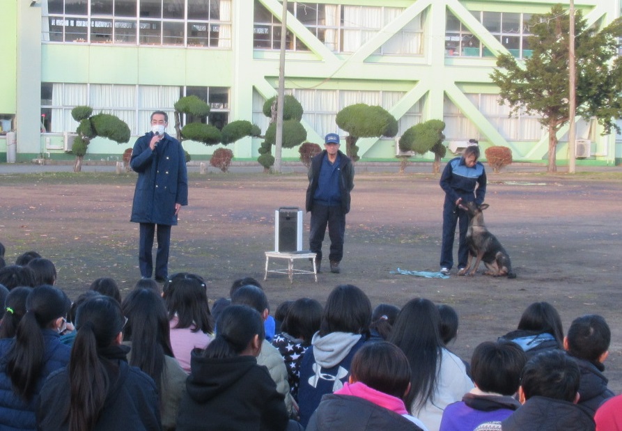 警察活動に対する理解を深めてもらうため、警察犬の活動を若葉小学校の児童のみなさん(4年生~6年生)に紹介しました。(11月27日)写真中央 太田勝美指導手、右 木村輝子指導手