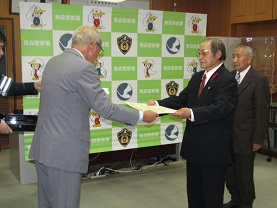 青森警察署と交通機動隊は、春の全国交通安全運動に伴い、広く県民に運動実施を周知することを目的として、出動式を行いました。運動期間中は白バイや警察官が管内主要交差点において交通取締りと警戒活動を強化しますので、みなさんも交通ルールを守り、交通事故を防止しましょう。感謝状贈呈(令和7年4月2日、4月3日)